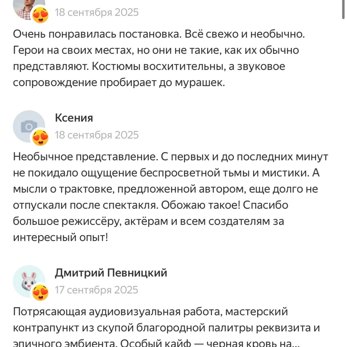Это не постдраматический театр. Постдрама всё ещё танцует с драмой, только задом наперёд. Мы не играем с формой — у нас нет деконструкции и дегуманизации. Есть воплощение смысла — не словесного, а энергетического. Нет никакой рефлексии — есть воплощённая сопричастность: зрителя, создаваемого мира, его внутреннего устройства, законов, жизни — создавая как бы единое тело.